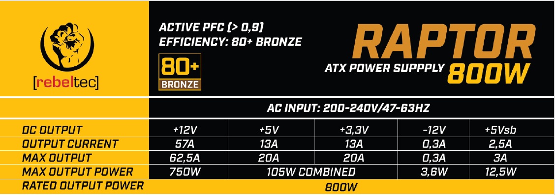 RAPTOR 800W BRONZE 80+, DC-DC, Rail Unique